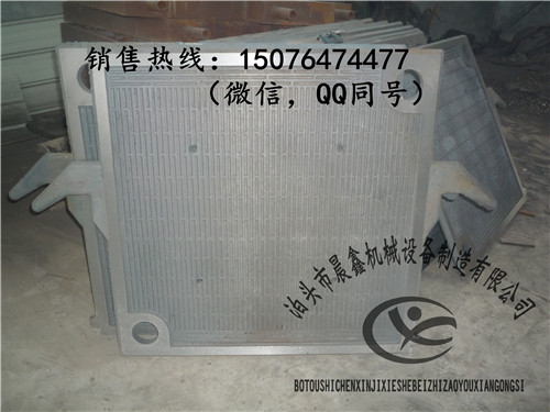 耐高溫鑄鐵壓濾機(jī)濾板濾框,晨鑫牌壓濾機(jī)濾板有不銹鋼材質(zhì),鋁合金材質(zhì),球墨鑄鐵材質(zhì),灰口鑄鐵材質(zhì),鑄鋼材質(zhì)等,其尺寸有285,320,450,500,630,700,800,810,870,900,930,1000,1250,1300,1500等等,也可根據(jù)客戶提供的圖紙來鑄造加工。板框式有手動壓緊、機(jī)械壓緊和液壓壓緊三種形式。手動壓緊是螺旋千斤頂推動壓緊板壓緊;機(jī)械壓緊是電動機(jī)配H型減速箱,經(jīng)機(jī)架傳動部件推動壓緊板壓緊;液壓壓緊是有液壓站經(jīng)機(jī)架上的液壓缸部件推動壓緊板壓緊。兩橫梁把止推板和壓緊裝置連在一起構(gòu)成機(jī)架,鑄鐵壓濾機(jī)機(jī)架上壓緊板與壓緊裝置餃接,在止推板和壓緊板之間依次交替排列著濾板和濾框,濾板和濾框之間夾著過濾介質(zhì);壓緊裝置推動壓緊板,將所有濾板和濾框壓緊在機(jī)架中,達(dá)到額定壓緊力后,即可進(jìn)行過濾。懸浮液從止推板上的進(jìn)料孔進(jìn)入各濾室(濾框與相鄰濾板構(gòu)成濾室),固體顆粒被過濾介質(zhì)截留在濾室內(nèi),濾液則透過介質(zhì),由出液孔排出機(jī)外。